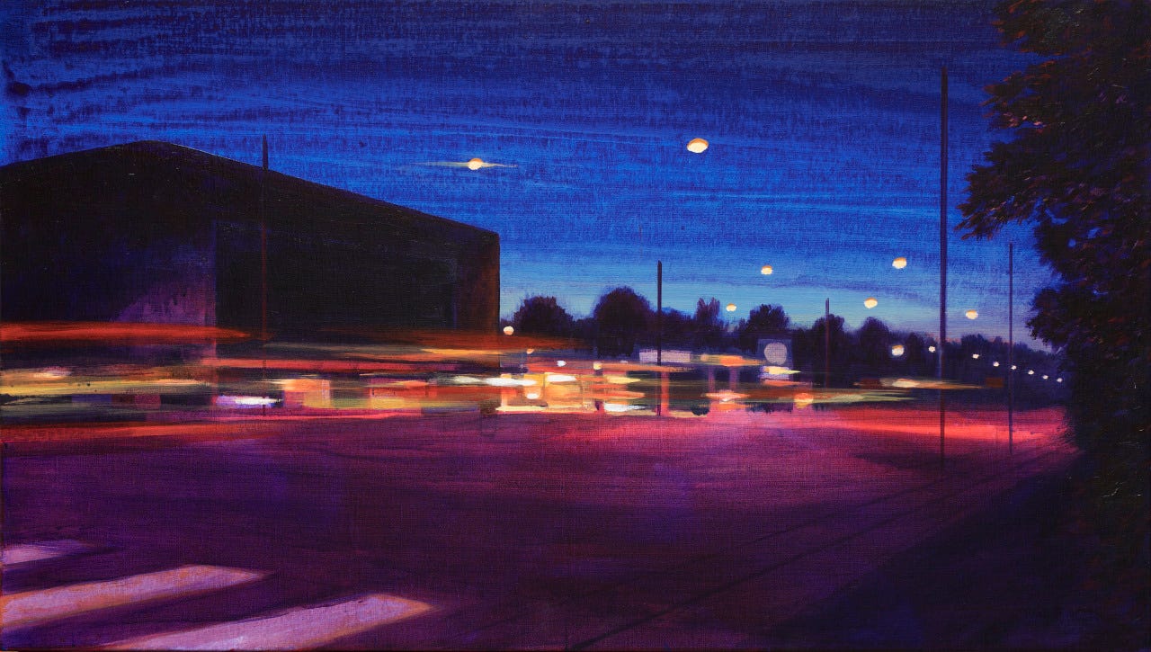 I have stopped worrying about natural light for my paintings because there is none. We are in winter, when the sun does come out it is suffocated by clouds. I sit and look at the works and worry over the reflection of the light, I worry that when we reach summer it will turn out the colours were muddied and details were missed. I am working in the dark, trying to piece together images. Because where I work, my bedroom, has no windows, often I walk into the kitchen and find myself surrounded by black silhouettes of furniture. I’m surprised by the lack of light despite this happening every year since forever. I check the time and am shocked.